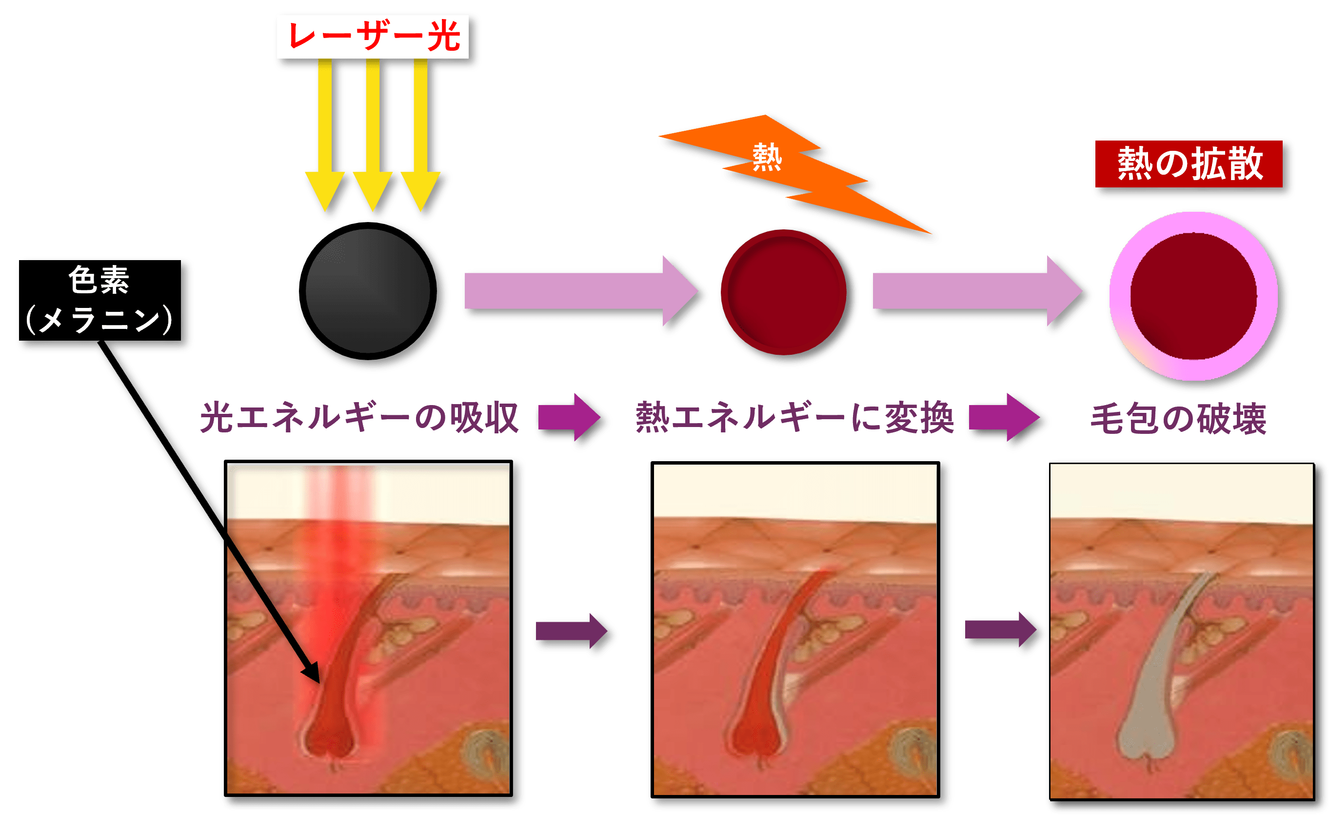毛のメラニン色素にのみ反応するレーザーを照射すると、黒い毛にあたったレーザーが熱エネルギーに変換され、その熱で毛の根元の毛母細胞や毛の周囲の毛包幹細胞といった「毛をそもそも作る細胞」を熱破壊します。現存する黒い毛に効くのであって、現存しないが将来新たに作られる毛には作用を及ぼしません。毛が太く色が黒いものほどレーザーが熱にしっかり変換されるため効果が高いですが、裏を返すと細くて色が薄い毛ほど効きづらくなります。毛抜きをして毛がない状態の毛穴には無効です。そのため、以下の3点に影響がでます。