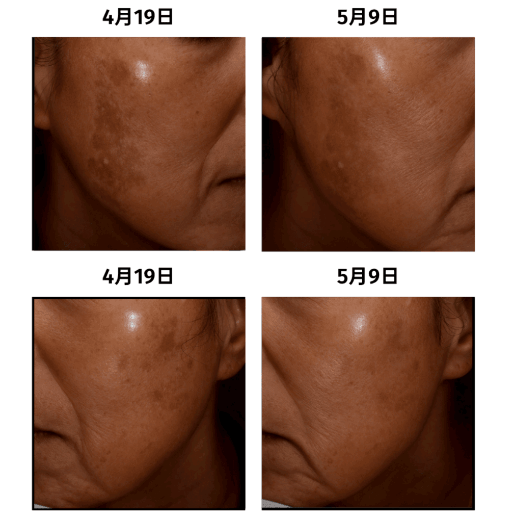 - 肝斑、くすみの改善: お顔の施術部位の色調を明るく導きます。